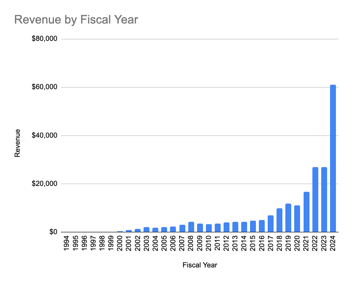 I also typed in their gross profit and operating income into a spreadsheet like any good little banking analyst would do but you can get those financials in a lot of other places. It is, however, worth noting that from 2023 to 2024 their revenues more than doubled, growing at 126% which is just insane at this scale and their gross margins increased from an already very good 57% to 73% year over year. Have we ever seen such a banner year for a public company in the history of capitalism?